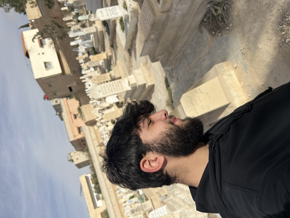 The image displays a young male subject in the foreground, positioned in profile facing towards the right. He has dark, curly hair and a full beard, and is wearing a black hooded sweatshirt. His facial expression indicates a subtle upturn of the lips. The background establishes the setting as a cemetery in Jirud, Syria, characterized by numerous light-colored tombstones of varying heights, many bearing visible Arabic script. These graves are arranged across a moderately sloped, unpaved terrain with sparse, dry vegetation. In the far background, several multi-story buildings with light-colored exteriors and some red architectural elements are visible under a clear, light blue sky. The scene is illuminated by natural daylight.