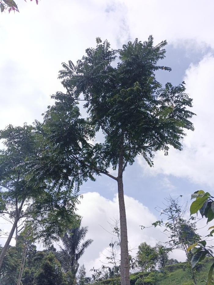 The image displays an upward-angled view of a natural environment in Nanlao, China, dominated by trees against a sky. A tall, slender tree with dark green, compound foliage stands centrally on the right, its textured brown trunk ascending vertically. To its left, another similar tree trunk is partially visible, also bearing dense green leaves. Further in the background, a variety of vegetation is present, including another tree with fan-like fronds, possibly a palm, and numerous other green trees and shrubs covering a sloping, verdant hillside. The upper portion of the frame features a bright sky with scattered white and light gray cumulus clouds, interspersed with patches of clear blue sky. No human figures or man-made structures are visible. The scene is illuminated by natural daylight.