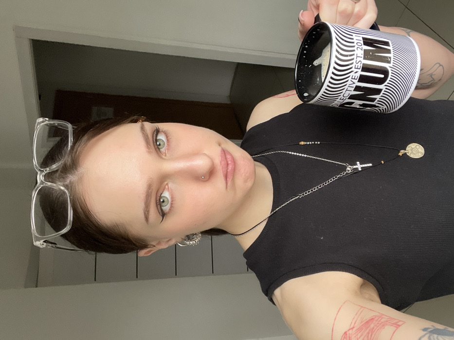 An indoor photograph from Rostov-on-Don, Russia, displays a young adult female looking directly at the camera with a slight pout. She has light green eyes with winged black eyeliner and a small silver stud piercing on her right nostril. Her dark hair is pulled back, with clear rectangular-framed glasses resting on top of her head. She wears a black ribbed sleeveless top. On her left ear, she wears a silver hoop earring composed of multiple concentric rings. Two necklaces are visible: a silver chain with a prominent silver cross pendant and a dark cord featuring a circular gold-toned medallion pendant and small beads. A red-ink tattoo is partially visible on her upper left arm, and another dark-lined tattoo is partially visible on her right leg below the knee. In her right hand, she holds a black and white striped mug with the text "MAGNUM COLLECTIVE EST. 2011," containing a light-colored, foamy beverage. The background features light-colored walls, with a vertical white panel displaying horizontal dark lines to the left and a darker brown door frame or opening to the right. A light-colored tiled floor is partially visible at the bottom right.