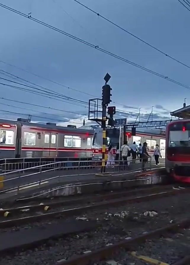 The scene is a railway station platform under an overcast sky, with electrical wires crisscrossing overhead