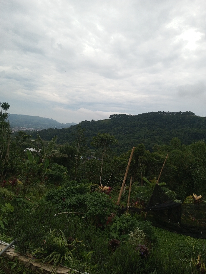This image depicts a panoramic view of a lush, verdant landscape under an overcast sky, situated in Hasanparthy mandal, India. The scene is captured from an elevated perspective, looking down and across a valley toward distant hills. The upper approximately 40% of the frame is occupied by a cloudy, grey sky, indicating diffused light with no direct sunlight. The immediate foreground (lower 30%) features dense, unmanicured green vegetation, consisting of various broad-leafed plants, grasses, and some plants exhibiting reddish-purple foliage. A light-colored pipe, possibly PVC or metal, is visible horizontally in the bottom-left corner, resting on what appears to be a low stone or concrete retaining wall. To the right, three light-brown wooden poles or bamboo stakes are angled upwards, supporting a dark mesh or netting structure partially draped over the vegetation. The midground (central 30%) displays a continuous expanse of dense green foliage and numerous trees, including identifiable banana plants with large leaves on the left. Beyond this immediate tree line, a small cluster of structures with white roofs is discernible in a distant valley, indicating a settlement. The background (upper 30% of the landscape) is dominated by a heavily forested hill or mountain, characterized by a dense dark green canopy. Further layers of hills recede into the distance, appearing hazier due to atmospheric perspective under the cloudy conditions. No individuals or animals are present, and no specific actions or interactions are depicted within the frame.