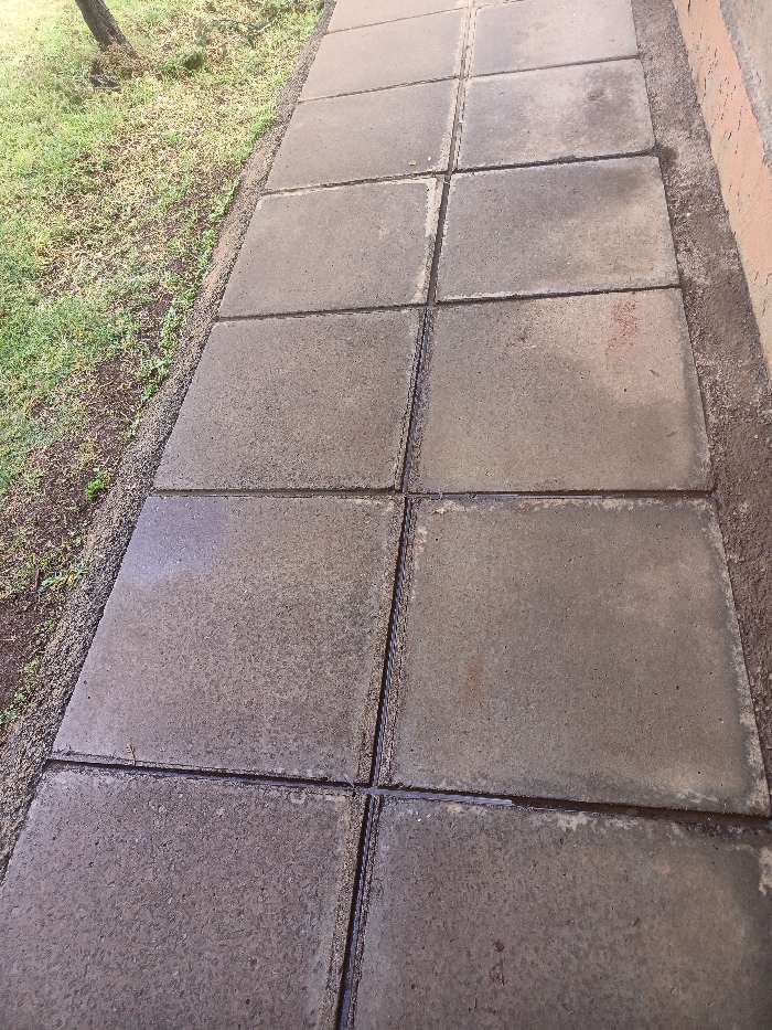 A pathway constructed of gray square pavers. The pavers are aligned in a straight row, with narrow dark lines separating them. Grass and soil border the left side of the pathway, while a wall runs along the right. The surface of the pavers appears slightly textured and worn. The overall composition is from a low, angled perspective, emphasizing the length and texture of the walkway.