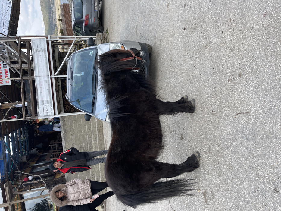 A black pony, wearing a red halter, stands in profile facing right on a light grey paved surface. Its head is positioned near the front bumper of a silver compact car, which is parked facing the viewer. The scene is located in Tsigov chark, Bulgaria, in front of a multi-story rustic wooden building with external stairs and a balcony. Bulgarian text is visible on a sign attached to the building, including "ЗА ПОРЪЧКИ 087". To the left of the silver car, near the building's concrete stairs, a woman in a cream-colored puffer jacket with a fur-lined hood and a man in a black and red puffer jacket are visible. The woman holds a light-colored object. Further back and to the right, a dark grey hatchback car with a Bulgarian license plate "PA 8349 KH" is parked. The background features rolling hills and a body of water under an overcast sky. Decorative red and white spherical ornaments hang near the building's entrance. A stack of firewood is present beneath the building's balcony.