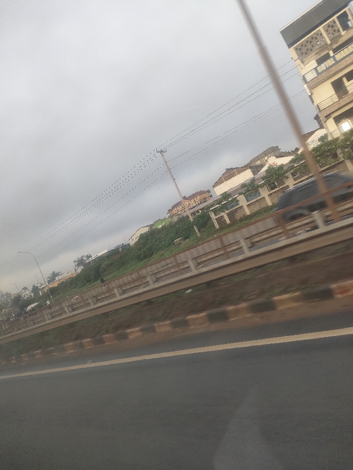 The image depicts a roadside scene in Biashara ward, Kenya, under an overcast sky. In the foreground, a dark asphalt road surface is visible, marked by a continuous yellow line running parallel to the viewer. Adjacent to the road, a series of alternating dark and light-colored curb blocks lead to a low concrete barrier topped with a metal guardrail. In the midground, beyond the barrier, an elevated green embankment with grass and sparse vegetation slopes upwards. A single individual, dressed in dark clothing, is walking on this elevated ground from left to right. The background features multiple buildings situated on a rising terrain. On the far right, a multi-story building with balconies and exposed concrete elements stands prominently. Below it, a faded sign partially displays "BURU" and "SHOPP", possibly indicating "Buruburu Shopping Centre" or similar. Further to the left, several other buildings with varying roof styles are visible amidst green foliage. Overhead power lines span across the sky, connected to a wooden utility pole in the mid-left and another pole in the far left. Another street lamp is visible on the far left. The perspective suggests the image was captured from a moving vehicle.