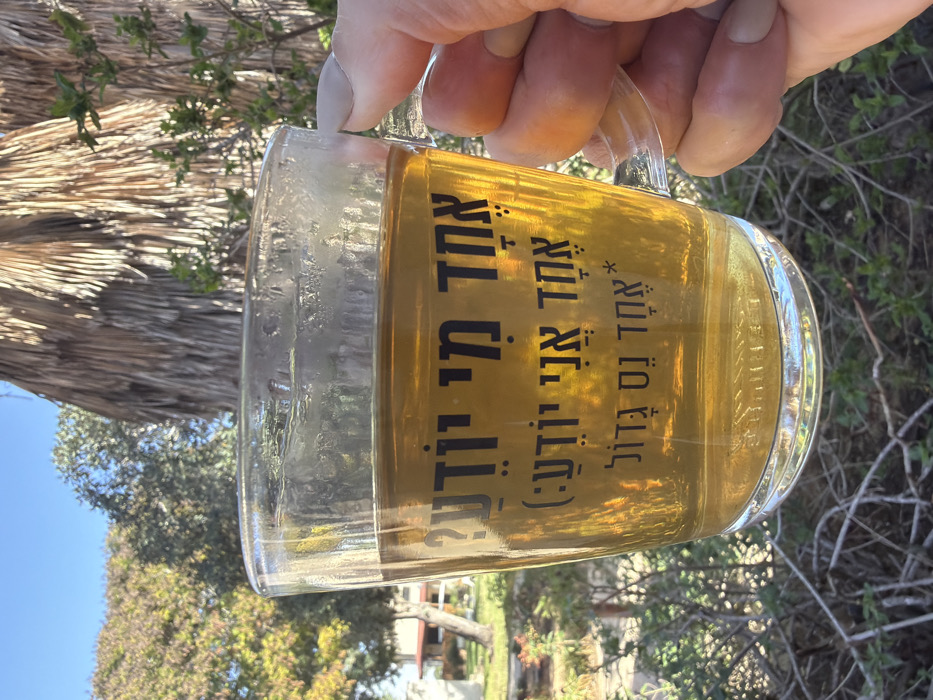 A human hand with light-colored manicured fingernails grips a clear glass mug filled with a yellowish-amber liquid. The mug features black Hebrew text inscribed on its side, reading: "אֶחָד מִי יוֹדֵעַ?" (Who knows one?), "אֶחָד אֲנִי יוֹדֵעַ:" (I know one:), and "*אֶחָד נִם גָדוֹל" (One great nap). The scene is outdoors in the Shaar HaNegev Regional Council, Israel, under a clear blue sky. The background includes a prominent dry palm tree, various green trees, and low-lying scrub brush. A light-colored building with a reddish roof is partially visible in the left mid-ground, obscured by foliage.