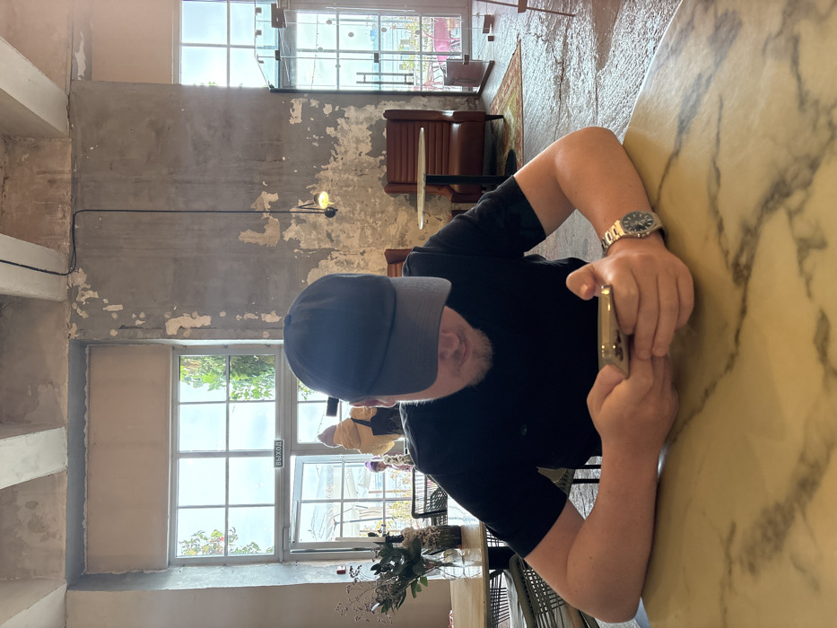 A male subject is seated at a light-colored, marble-patterned table in an indoor commercial establishment in Saint Petersburg, Russia. The subject, wearing a dark baseball cap and a black short-sleeved t-shirt, displays a short beard and a silver-toned wristwatch on his left wrist. He is actively engaged with a horizontally held, silver-toned smartphone, his gaze directed downwards at the device. The interior exhibits an industrial aesthetic, featuring exposed concrete ceiling beams and distressed, peeling plaster walls that reveal a darker gray layer beneath. A minimalist dark-colored pendant light fixture with a small, glowing bulb hangs from the ceiling in the mid-ground. To the left of the primary subject, a round table with a dark chair holds a vase containing dried floral arrangements. To the right, a small round table is paired with a brown, ribbed wingback armchair, situated on a patterned rug laid over a concrete floor. Large multi-paned glass windows and glass doors frame the exterior. Through the left set of doors, marked with a Russian "ВЫХОД" (EXIT) sign, two individuals are partially visible outside: one in a yellow hooded jacket, holding a dark bag, and a smaller, partially obscured figure. Green foliage, a cloudy sky, distant structures, and a white tent-like structure are visible through the windows and doorways. No direct interaction between the depicted individuals is observed.