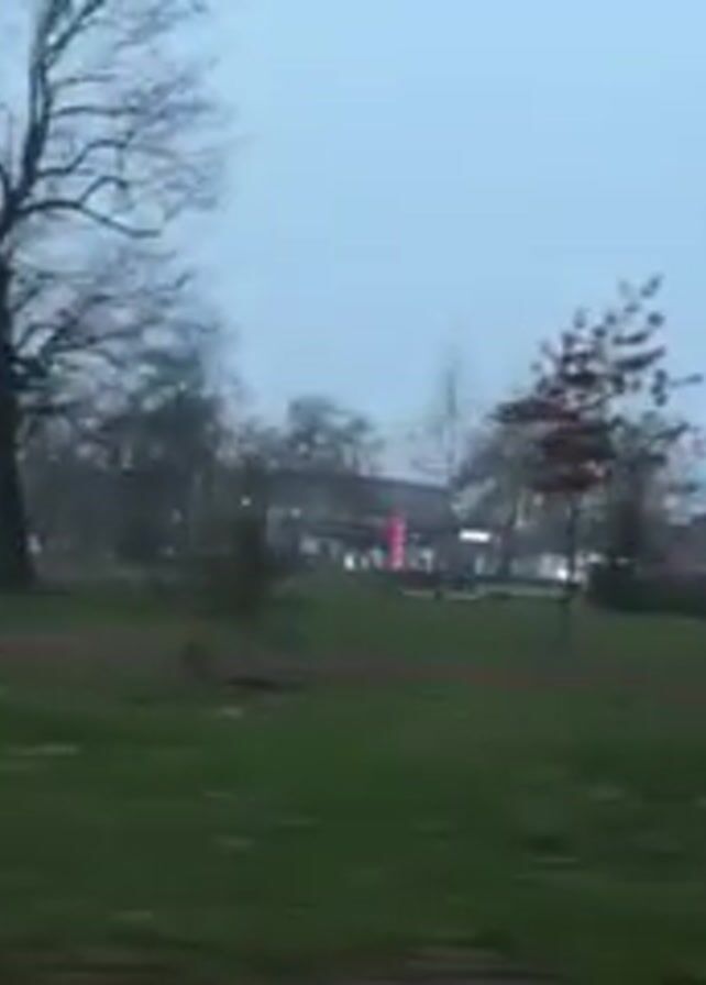 The camera moves slowly through a park on an overcast day, revealing a lawn interspersed with bare trees and a few evergreen trees