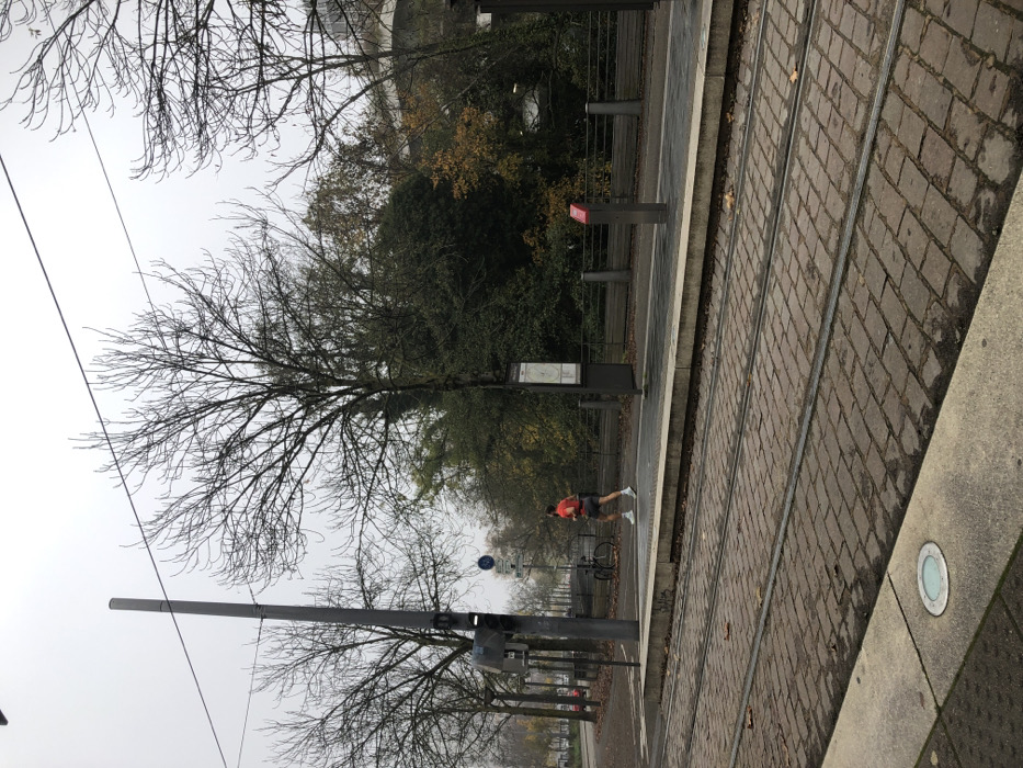 This image depicts an outdoor urban environment at a tram stop in Schiltigheim, France, under an overcast sky. In the foreground, two sets of tram tracks are embedded in a cobblestone surface. Adjacent to the tracks on the right is a concrete tram platform. A single male individual, wearing a red short-sleeved shirt, dark shorts, and white athletic shoes, is captured in motion, jogging from left to right along the paved area next to the tram platform. His gaze is directed forward. Along the tram platform and its immediate vicinity, several objects are visible: a tall, dark gray pole supporting overhead lines on the far left, a smaller dark gray pole with an attached sign further right, a black information stand displaying a white map, and a red rectangular post. Behind the platform, a paved sidewalk is bordered by a low metal fence. A dark bicycle is parked near a blue circular sign indicating a cycling path. Beyond the fence, a dense cluster of trees and bushes forms a natural backdrop. Many trees are bare-branched, suggesting late autumn or early winter, while some retain green foliage or display autumnal colors. Scattered fallen leaves are visible on the ground surfaces. In the far left background, additional bare trees line a street.