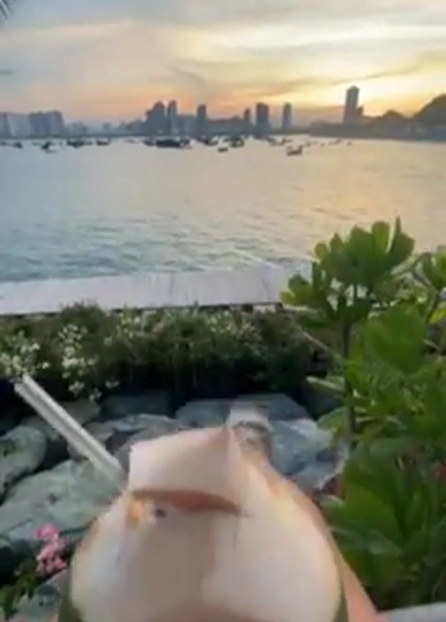 someone holding a coconut with a straw in front of a sunset beach scene. The coconut has the words "Marina Beach Club, Nha Trang" printed on it. In the background, there's a bay with several boats and a city skyline. The person is sitting on a stone seating arrangement, with greenery visible around them. The camera then pans up to show the full sunset scene, including a palm leaf in the upper left corner. The scene gives an impression of leisure and relaxation in a tropical location.