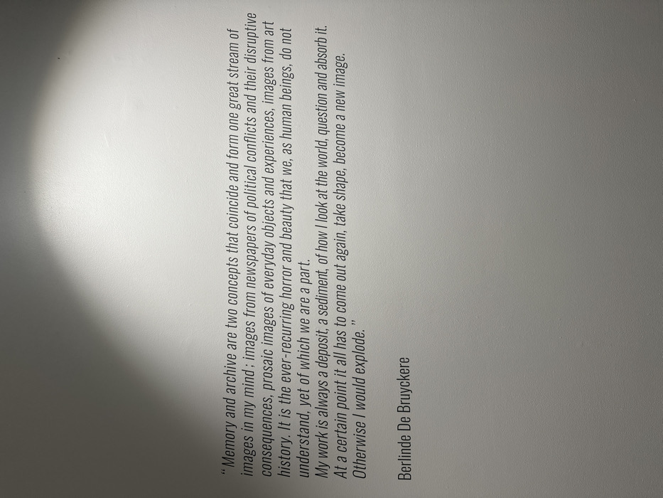 The image displays a light-colored, textured wall, likely painted white or light grey. Printed on the lower central portion of the wall in dark grey or black sans-serif font is a quotation followed by an artist attribution. The text reads: "Memory and archive are two concepts that coincide and form one great stream of images in my mind; images from newspapers of political conflicts and their disruptive consequences, prosaic images of everyday objects and experiences, images from art history. It is the ever-recurring horror and beauty that we, as human beings, do not understand, yet of which we are a part. My work is always a deposit, a sediment, of how I look at the world, question and absorb it. At a certain point it all has to come out again, take shape, become a new image. Otherwise I would explode." Below the quotation, the name "Berlinde De Bruyckere" is displayed. A distinct diagonal shadow or darker illumination crosses the upper left quadrant of the wall, suggesting directional lighting from an external source or a ceiling fixture. No people, specific objects other than the wall and text, or interactions are visible. The scene is an interior, indicative of an art gallery, museum, or exhibition space in the city of Paris, France, though the exact location within the city is not identifiable from the image content.