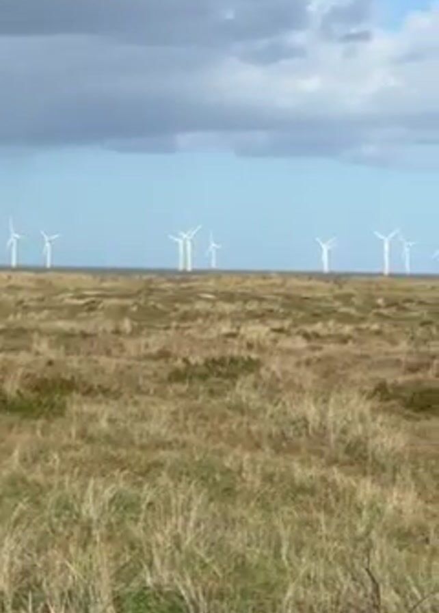 field of dry, golden-brown grass in the foreground. In the background, a calm sea meets a partially cloudy sky. Several wind turbines are visible on the horizon, standing tall in the sea. Two small figures, likely people, can be seen on the left of the frame near the horizon. The camera remains static throughout the video.