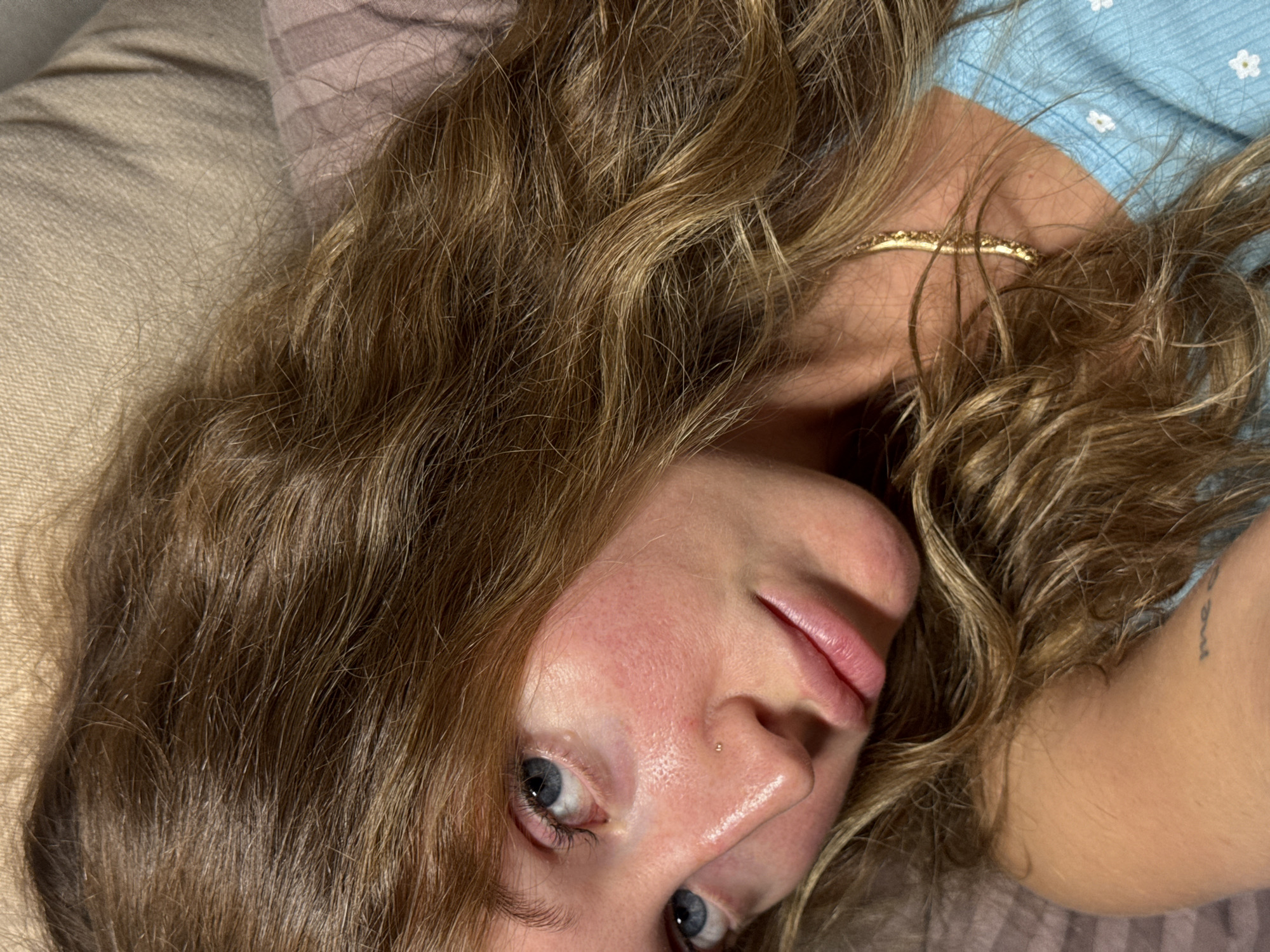 A close-up, angled shot depicts a woman with light brown, wavy hair lying down. Her face is prominent, with visible facial features including blue eyes, a nose piercing, and full lips. The background is blurred, showing light-colored fabrics, possibly a pillow and bedding. A glimpse of her arm and a light blue garment with a floral pattern are visible. A gold necklace adorns her neck. No information suggests this photo was taken in Chaikovsky, Russia.