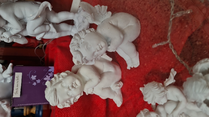 - "The image captures a close-up display of multiple white, unpainted plaster or ceramic cherub figurines arranged on a vibrant red, textured fabric surface" by FM-fR28z1, licensed under CC BY 4.0