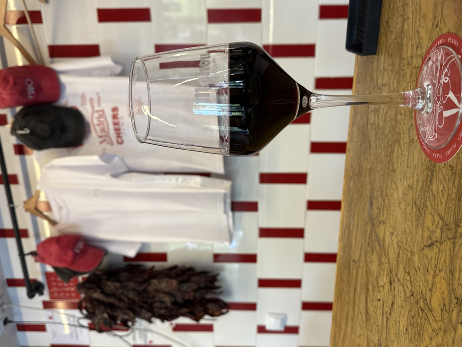 A wine glass containing dark red liquid, likely red wine, rests on a textured wooden counter in the foreground