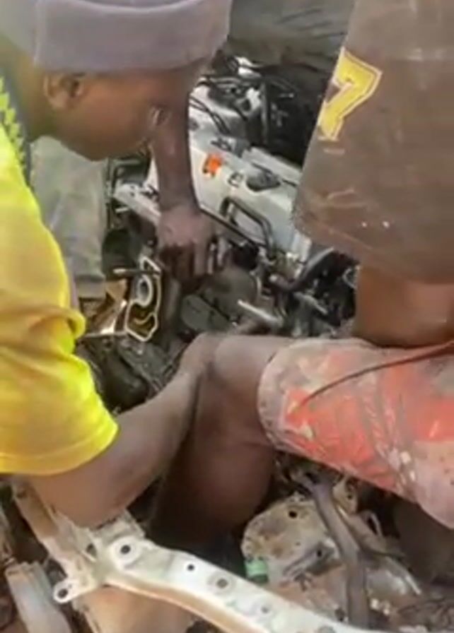 Three men are working on an engine in the front of a car. The car frame is white and the engine is silver and black. The men are standing around the engine bay, reaching in to work on the engine. The man on the left is wearing a yellow shirt and a light grey cap. The man on the right is wearing patterned shorts and a dirty shirt with yellow writing. The third man is mostly hidden behind the engine. The scene appears to be outdoors.