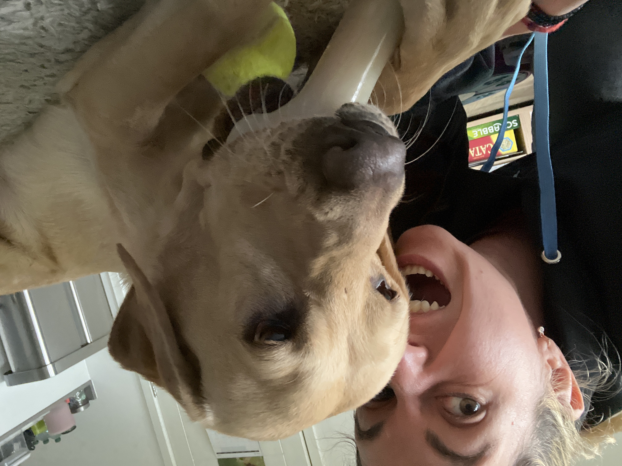 A photograph shows a tan Labrador Retriever dog chewing on a white bone-shaped toy and a tennis ball. A woman is positioned next to the dog, smiling with her mouth open. The dog is facing to the left, while the woman is facing downwards. A blue lanyard with a white attachment hangs from her black hoodie. In the background, there are board game boxes labeled "CATAN" and "SCRIBBLE." The location appears to be inside a home, potentially in the Borough of Runnymede, United Kingdom. The photo is angled sideways.
