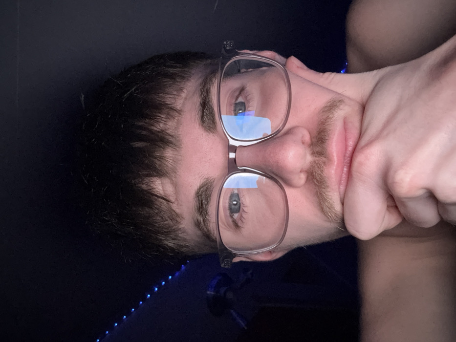 A young adult male, with fair skin, dark hair styled with a fringe, and blue eyes, is depicted in a close-up, head-and-shoulders portrait. He wears clear-framed eyeglasses, which reflect a blue light source. A light mustache and stubble are visible around his mouth. His right hand is positioned under his chin, with his fingers supporting his jawline. His lips are slightly pouted. The subject is looking directly towards the camera. The background is dark, illuminated by a string of blue LED lights running diagonally from the upper left, and a dark, circular object is faintly visible in the upper left quadrant. The scene is located in a room within the city of Gerstheim, France.