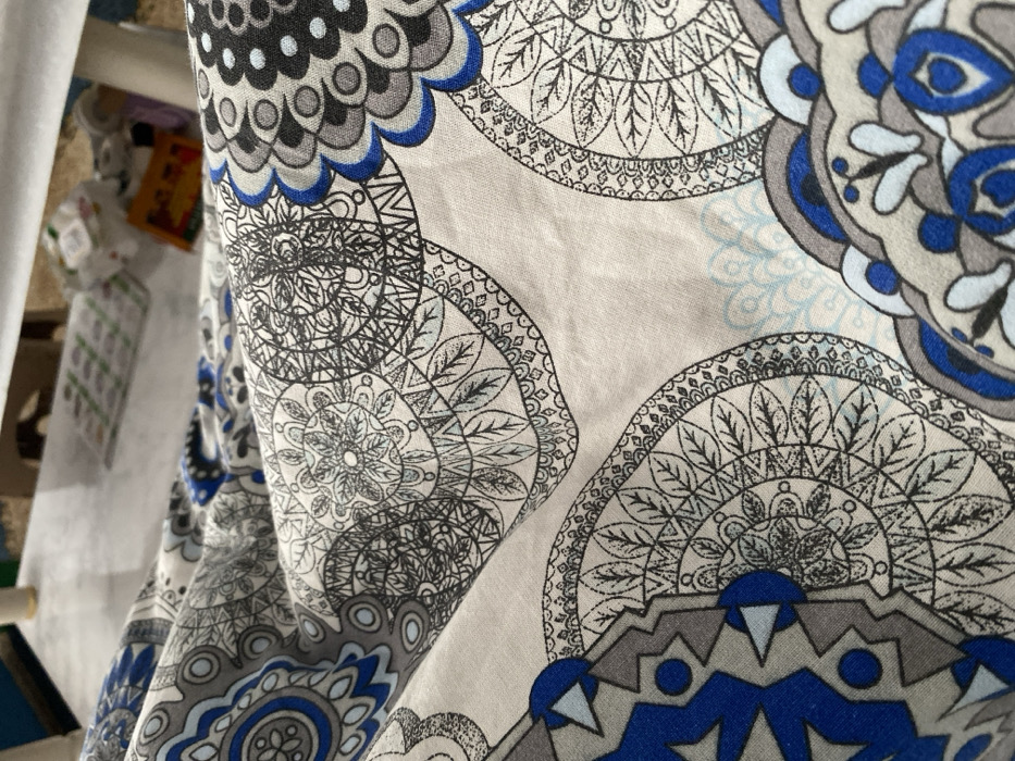 The image presents a close-up, angled view of a folded textile fabric, located in Sredkovets, Bulgaria. The fabric features a repeating pattern of intricate, mandala-style circular and semi-circular motifs. The primary colors in the pattern are various shades of blue (including royal blue and lighter blues), grey (dark and light), and black for outlining and finer details, all set against an off-white or light cream background. Visible creases and folds indicate the fabric is draped or resting on a surface. In the heavily blurred background, a light-colored surface, consistent with a workbench or table, is discernible. On this surface, indistinct objects are present, including a white spool of thread positioned to the left, flat items with green markings, and several small, colorful objects further back, suggesting a workspace or crafting environment. No individuals, explicit actions, or direct interactions are visible.