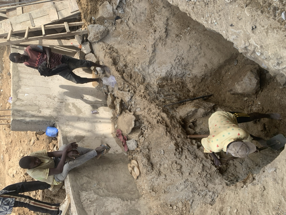 The scene depicts an outdoor construction site in Abuja, Nigeria, under bright daylight conditions