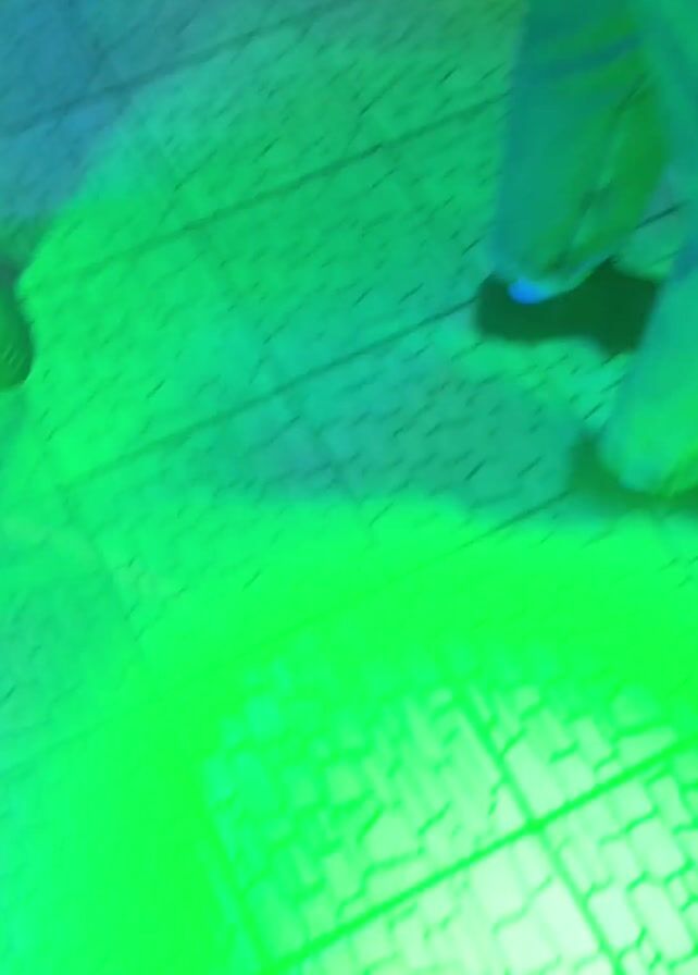 feet of people dancing on a tile floor. The lighting changes between green and blue. The dancers are wearing various types of footwear, including dress shoes, sneakers, and casual shoes. The floor has a pattern that resembles small bricks.