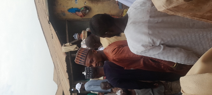 The image depicts an outdoor scene in Toto, Nigeria, under an overcast sky, featuring a crowd of individuals
