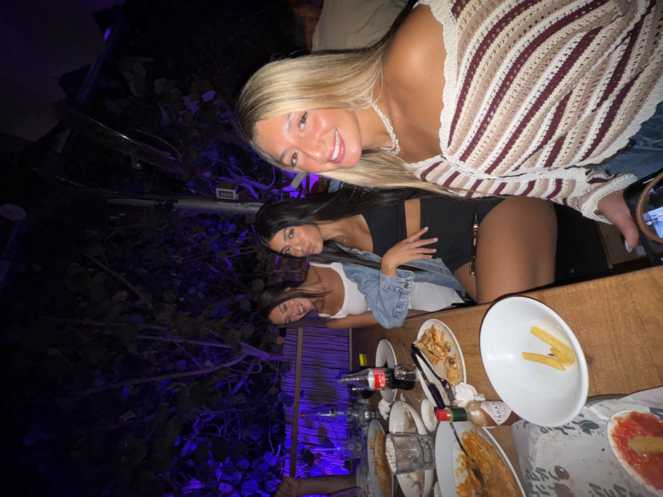 The image depicts a nighttime scene at an outdoor or semi-outdoor restaurant or bar located in Ramat Gan, Israel. Three young women are seated at a wooden table, posing for the camera amidst post-meal remnants. The woman on the far right, in the foreground, has long blonde hair and is smiling directly at the camera. She wears a striped, off-the-shoulder crocheted top and a white beaded necklace, with a visible nose piercing. Her left hand holds a smartphone. To her immediate left, a woman with long dark hair, wearing a light blue denim jacket over a black crop top and black shorts, faces the camera with a slight pout. A dark, pen-like object rests on her right thigh. To the far left, a third woman with long dark hair, wearing a white tank top, smiles broadly, partially obscured by the middle woman and table items. A partial arm of an unseen individual is visible to the far left. The wooden table is laden with used dishes: multiple white plates containing remnants of pizza crusts and sauce, a white bowl with a few french fries, empty glass tumblers, a glass bottle of Coca-Cola, a red bottle of Tabasco sauce, and various silverware including tongs. The background is dark, featuring lush foliage illuminated by purple ambient lighting and a bamboo-slatted barrier. Overhead, dark structural elements are visible. The scene suggests a relaxed social gathering after a meal.