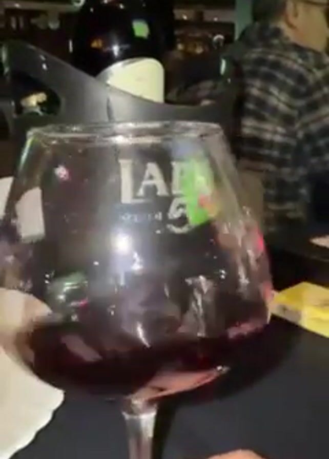 The video depicts a close-up shot of a glass of red wine held by a person's hand at a restaurant or bar