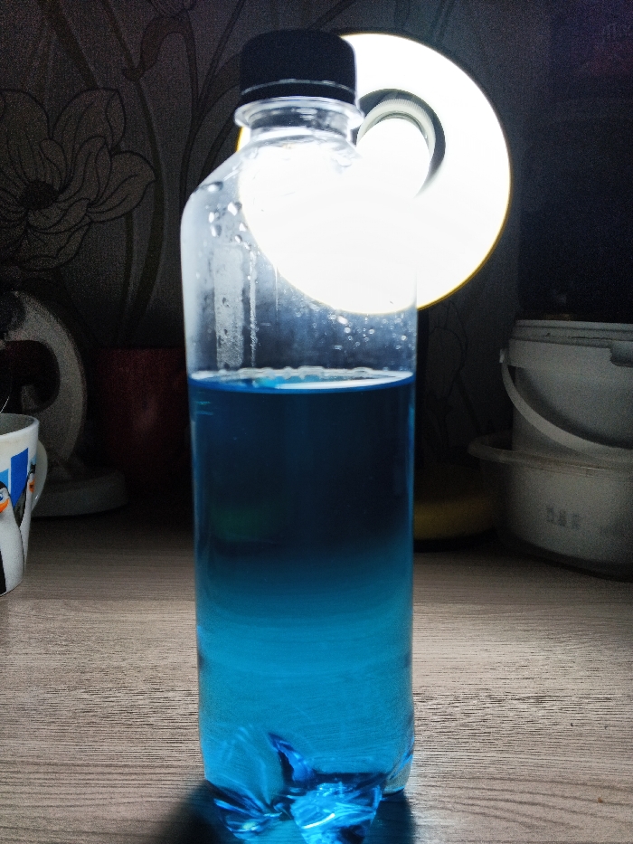 The scene depicts an indoor environment. A clear plastic bottle with a black screw-on cap is centrally positioned on a light-colored, wood-grained surface. The bottle contains a blue liquid, which exhibits a gradient from dark blue at the top to a lighter, more vibrant blue towards the bottom, filling approximately three-quarters of the bottle's volume. Condensation or water droplets are present on the exterior of the bottle above the liquid line. A prominent, bright circular light source is situated directly behind the upper half of the bottle, illuminating it from the rear. In the background to the left, a white mug adorned with a penguin design is partially visible, along with a dark reddish-brown cylindrical object and dark-toned floral wallpaper. To the right of the bottle, a stack of light-colored plastic containers is present. No specific geographical markers or contextual elements are discernible to determine a location within Chaikovsky, Russia; the setting appears to be a domestic or casual interior. No individuals are visible.