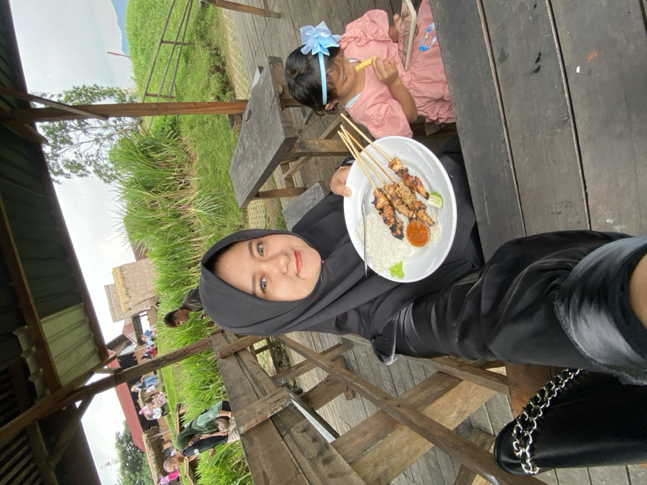 The image captures an outdoor dining scene in Tamiajeng, Indonesia. In the foreground, a woman wearing a black hijab and black clothing is taking a selfie, smiling directly at the camera. She holds a white plate containing a portion of white rice, three skewers of grilled meat (satay), a small container of orange sauce, and a lime wedge. To her right, a young child, dressed in a pink garment with a light blue bow in her hair, is seated. The child is actively eating a yellow, stick-shaped food item while holding a white smartphone or small tablet. Both subjects are positioned at a rustic, dark wooden table within a sheltered area constructed of wooden beams and planks. The background reveals a verdant landscape with tall green grasses, additional wooden structures and gazebos, and other people scattered across a gentle slope. Distant hills are visible under an overcast sky.
