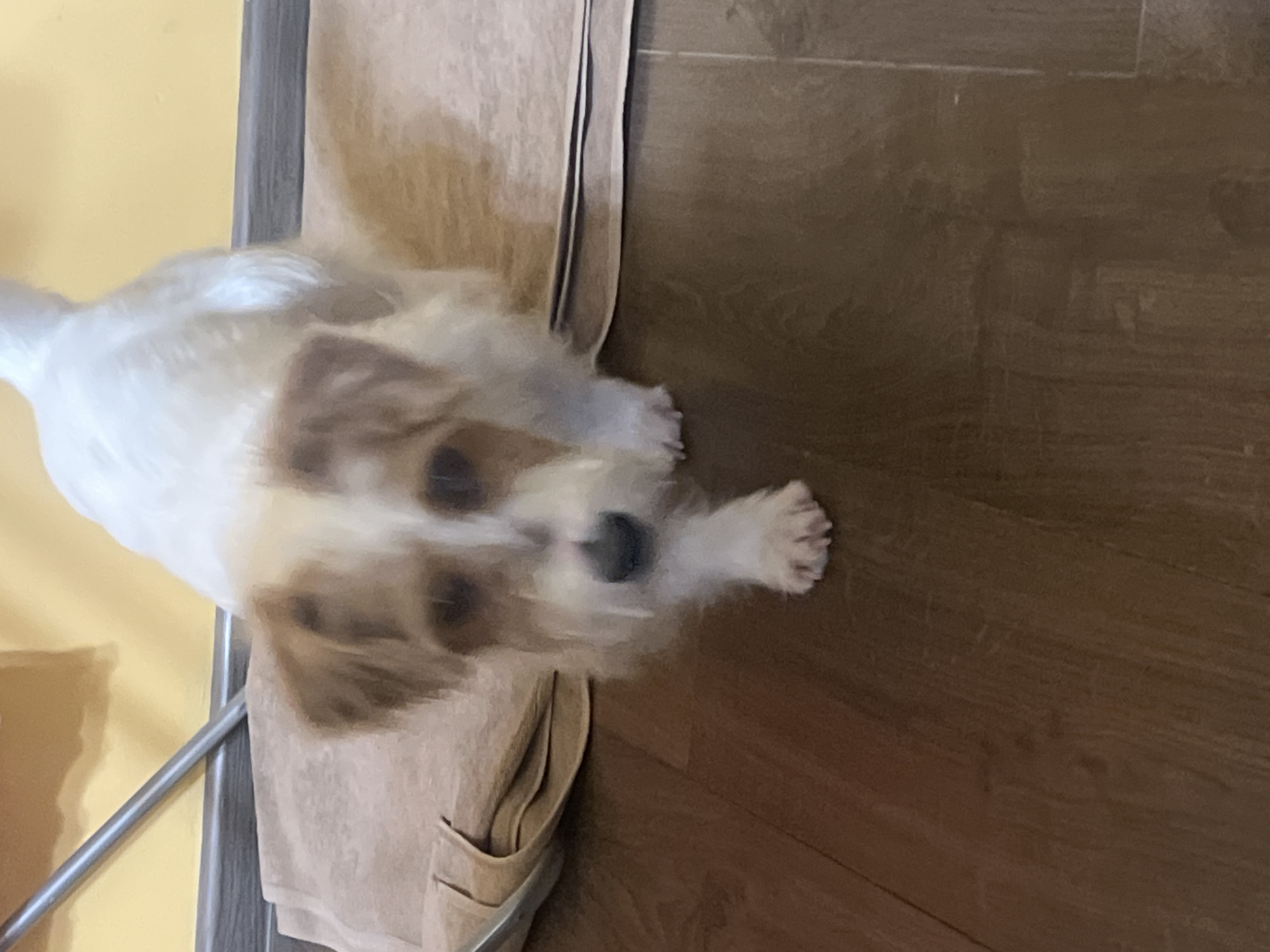 The scene depicts an interior setting, identified as being within the city of Belgrade, Serbia. A small, wire-haired dog, primarily white with distinct brown markings on its ears and around its eyes, is observed walking forward, centrally positioned within the frame. The dog possesses a black nose and appears to be in motion, with its left front paw slightly elevated. The flooring consists of dark brown, wood-patterned planks. A dark grey baseboard runs along the bottom of a solid yellow wall. Resting on the floor against the baseboard, behind the dog's left side, is a folded light brown or beige textile item, possibly a mat or towel. A thin, silver-colored metal rod is leaning diagonally against the yellow wall, behind the textile object, extending from the lower left towards the upper right of the background. No human subjects or direct interactions are visible.