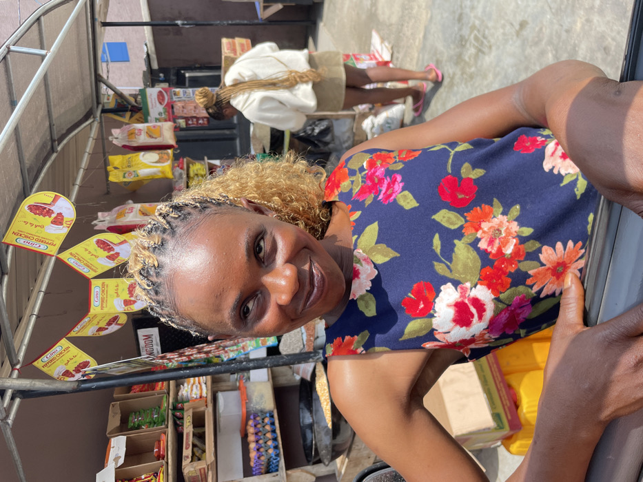 An outdoor scene in Iranla, Nigeria, under bright daylight, features a market stall. In the foreground, a dark-skinned woman smiles, looking upward and to her right. She has braided hair on her scalp transitioning to curly blonde extensions and wears a sleeveless dark blue dress with a prominent floral pattern of red, pink, white, and orange flowers with green leaves. Her hands rest on a dark ledge. Behind her and to her left, a market stall operates under a metal canopy from which multiple yellow "Gino PEPPERED CHICKEN" banners hang. Shelves within the stall display packaged goods, including several trays of brown eggs and a large black pan filled with grain. A sign partially reading "KINGDOM" is also visible. Further in the background, to the right, a second dark-skinned woman stands facing away from the camera. She has long, light-colored braids, wears a light-colored long-sleeved top, a light brown skirt, and pink flip-flops, appearing to be attending to merchandise near boxes and bags on the paved ground. Building structures are visible in the far background.