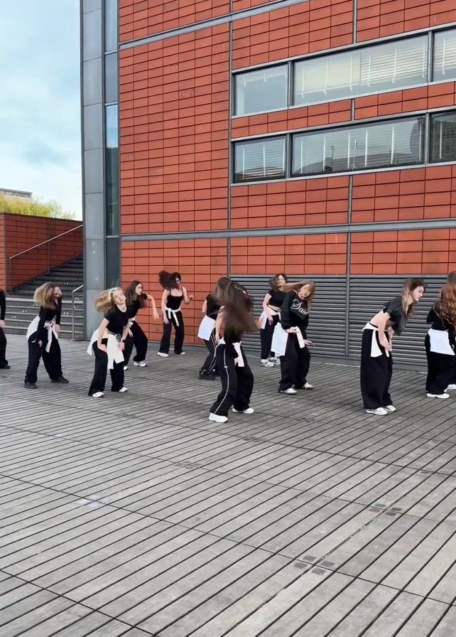 A group of about ten young women, some with long hair, wearing black tops and pants, with white cloths around their waists, are performing a dance on a wooden platform in front of a brick building. They bend forward, flipping their hair. They turn from side to side. Cars and stairs are seen in the background. The sky is overcast.