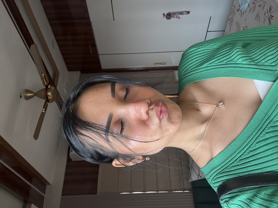 The scene is an indoor residential setting, located within a building in Howrah, India. A female individual, appearing to be a young adult, is depicted from the chest up, positioned centrally in the frame. She has dark hair, partially pulled back, with several strands falling forward over her forehead and temples. Her eyes are closed, and her lips are pursed into a distinct pouting expression. Her skin tone appears warm. She is wearing a bright green, ribbed knit, long-sleeved top or cardigan over a white inner garment. A gold-colored necklace with a small, square-cut clear gemstone pendant is visible at her throat. A small, gold-colored heart-shaped hoop earring is present in her left ear. A dark strap, possibly from a bag, is visible on her left shoulder. The background indicates a bedroom or similar living space. The ceiling is white with decorative dark wooden false ceiling elements and features a three-bladed, gold-colored ceiling fan, which appears stationary. To the right of the individual, a large wardrobe or cupboard unit with two-toned panels (dark wood grain on top, lighter solid color below) and metallic horizontal handles is visible. A patterned piece of fabric or scarf is hanging from one of the wardrobe handles. On the far right, a patterned bedspread or blanket is partially visible on what appears to be a bed. To the far left, behind the individual's head, a dark green upholstered headboard or piece of furniture and a pillow with a subtle geometric pattern are visible. The lighting is soft and even, suggesting natural light from an unseen source.