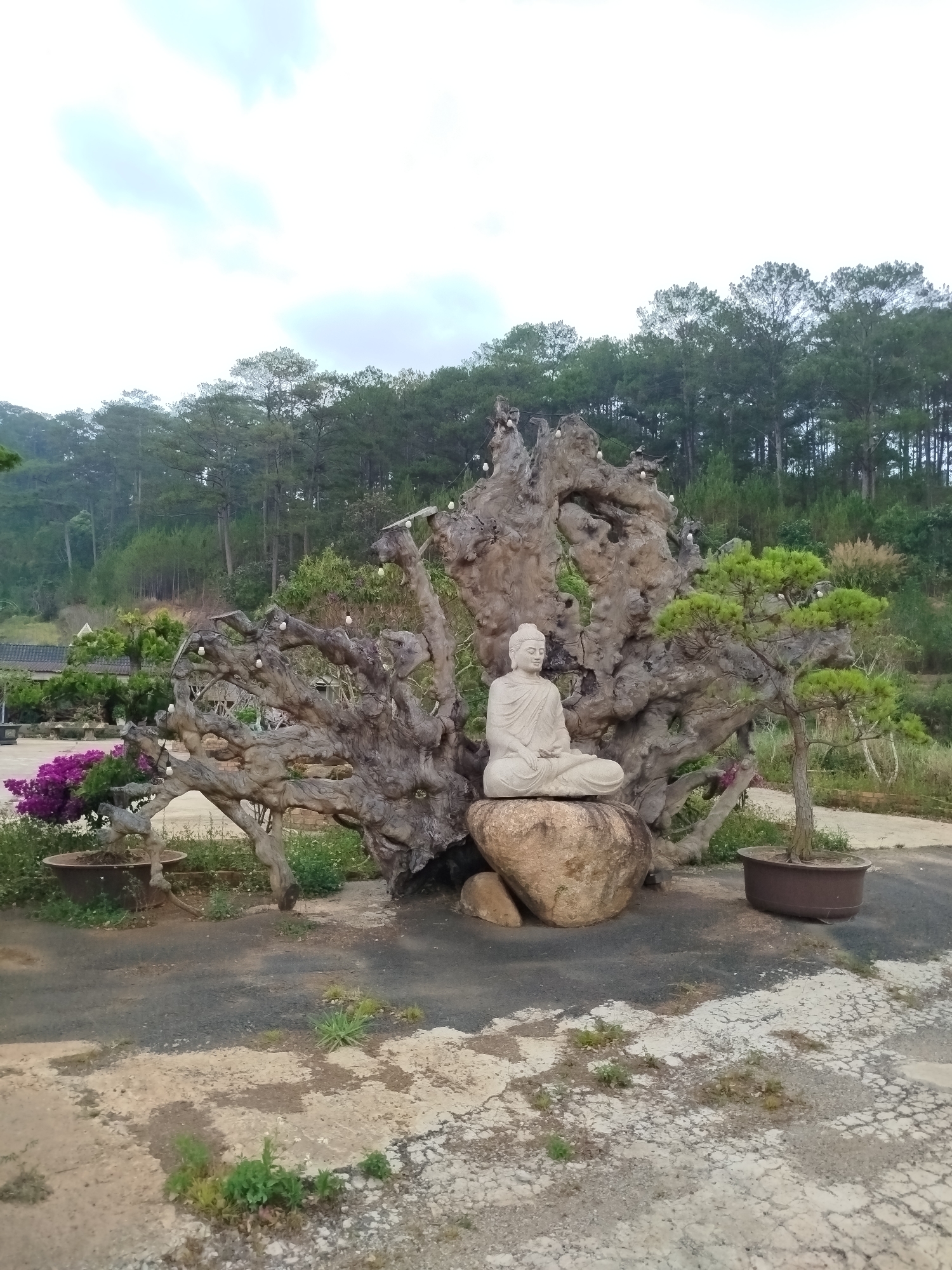 A photograph taken in Hiệp Thạnh, Vietnam, shows a seated Buddha statue in a meditative pose, centered and placed on a large rock. Behind the statue is a gnarled, leafless tree trunk with light bulbs attached to its branches. To the left is a potted plant with purple flowers, and to the right is a potted bonsai tree. The ground is a cracked asphalt surface with patches of vegetation. In the background is a forested area with tall trees, under an overcast sky.