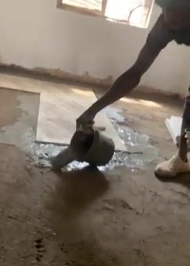 A person is laying tiles on a floor in a room. The floor is uneven and partially covered with a brown, muddy substance. The person pours a gray liquid from a dark bucket onto the floor. A small, rectangular object lies next to a tile already laid. Light comes in through a window. The walls of the room are white and appear unfinished. The person is wearing white shoes.