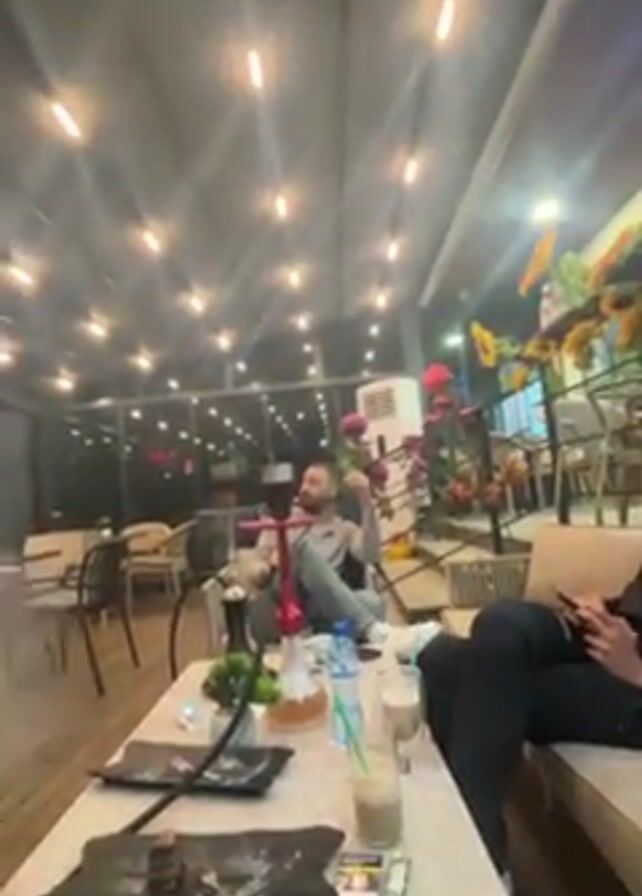 man exhaling a large cloud of hookah smoke at a cafe. He is seated at a table with another person, who is looking at their phone. The table also has drinks, a dessert plate, cigarettes, and the hookah. The cafe has modern decor with flowers and lights.
