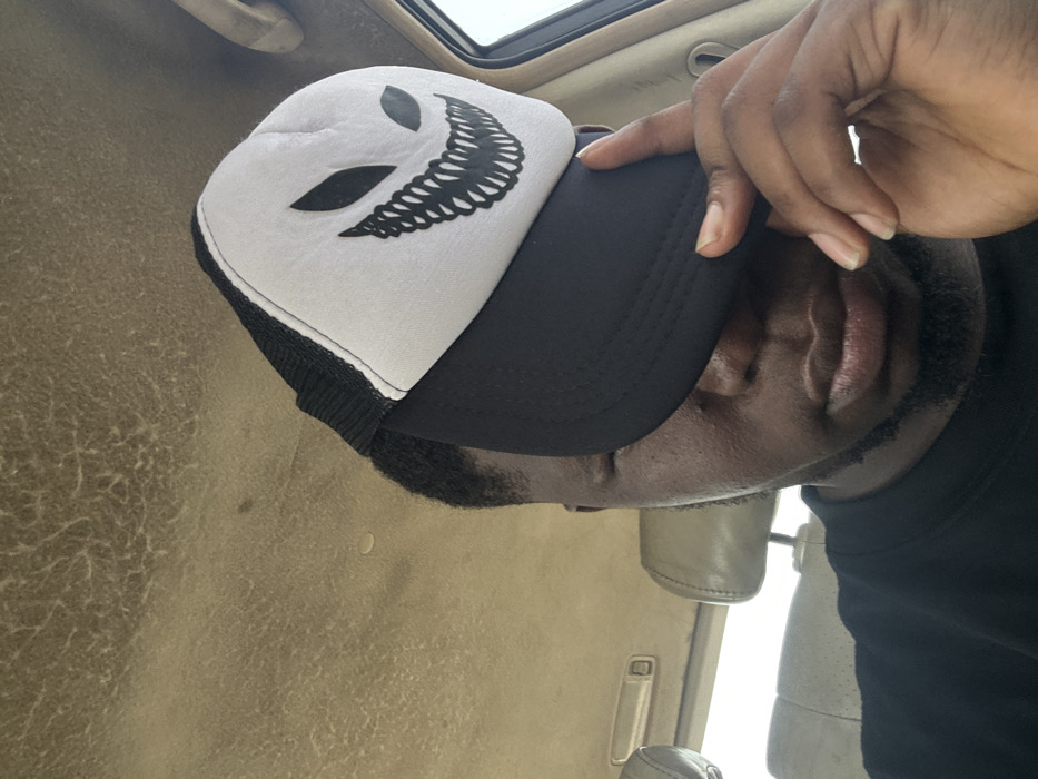 The image captures a close-up, chest-up view of a dark-skinned male subject within the interior of a vehicle. The subject wears a black long-sleeved garment and a black and white trucker-style cap. The cap features a white front panel with a prominent black graphic depicting a stylized, menacing face with sharp teeth and two elongated, almond-shaped eyes; the brim and mesh backing are black. The subject's left hand is positioned on the cap's black brim, pulling it down to obscure the eyes. The background reveals the vehicle's interior: a light brown or tan headliner, exhibiting visible texture and signs of wear, occupies the upper frame. A section of a light-colored (tan/beige) car seat headrest is visible to the left of the subject. Bright, diffuse light from an external source is visible through a window on the right side, and a light-colored vehicle grab handle is present above the window on the headliner. No discernible visual information within the image definitively identifies the location as Epe, Nigeria.