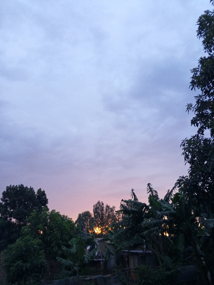 This image displays an outdoor scene in Borabu Chitago ward, Kenya, observed during either sunrise or sunset. The upper two-thirds of the frame features a sky transitioning from light blue-grey at the zenith to pale pink and purple tones along the horizon, with scattered, thin cloud cover. The lower third is densely populated with dark green foliage, including various broadleaf trees and prominent banana plants characterized by large leaves. A bright orange-yellow light, indicative of the sun, is visible breaking through the tree canopy at the horizon. In the mid-ground, partially obscured by the surrounding vegetation, are several structures distinguished by dark, corrugated metal roofs. No human subjects, animals, or specific activities are present within the frame.