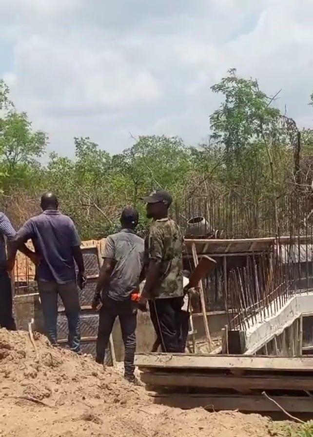 The video depicts four men standing near a construction site, observing a concrete structure with reinforcing steel. The surrounding environment consists of sandy soil, trees, and a cloudy sky. A black water tank is visible near a pile of dirt. One man walks away from the construction site, carrying what appears to be a tool.