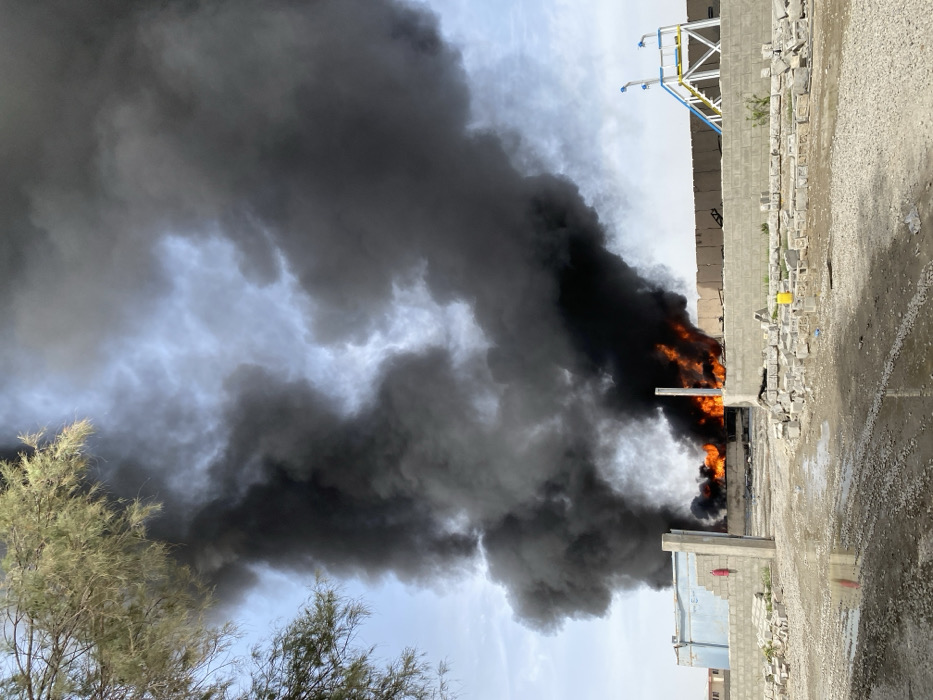 A large industrial fire is depicted in Khvoshab, Afghanistan, characterized by voluminous, dense black smoke rising against a partly cloudy, light blue sky