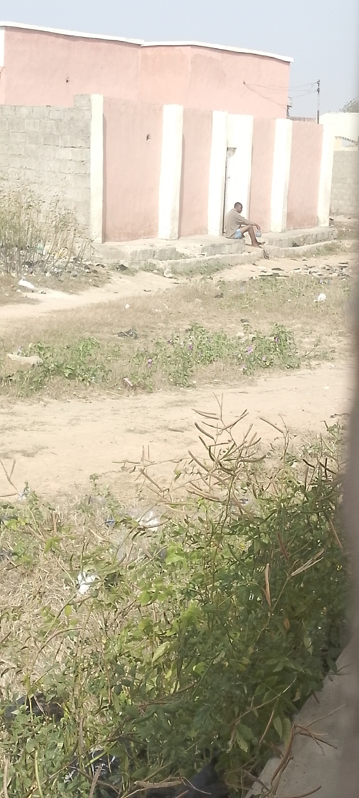 A lone man sits on the steps of a pink building with white pillars, possibly drinking from a container. The surrounding area appears arid, with sparse vegetation and dirt paths. Litter is scattered around the scene. The building is partially surrounded by a low gray brick wall. The lower portion of the image is filled with green foliage, obscuring some of the view.