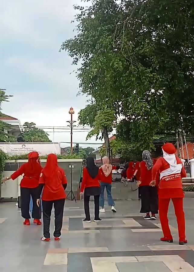 A group of people is exercising in a public space outdoors. There are approximately nine people who appear to be adults dressed in red jackets. Several are wearing hijabs. They are moving their arms and legs in a coordinated fashion that resembles a dance or exercise routine. The ground is a paved surface with a patterned design of light and dark squares. A large tree is visible to the left side of the frame, and there is a light post and some buildings in the background. The sky is overcast.