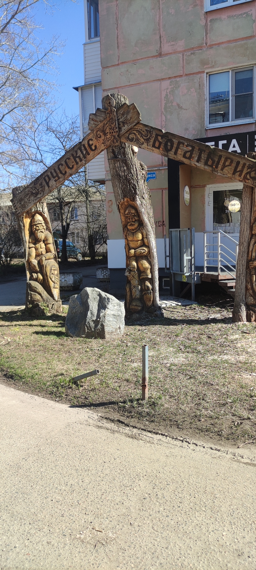 The image depicts a wooden archway labeled "RUSSIAN BOGATYRS" (Русские Богатыри) in Chaikovsky, Russia. The archway is constructed from carved tree trunks, each featuring figures. A large gray rock sits near one of the carved trunks. The archway is located near a building with a white door and steps. A metal pole is visible in the grassy area in front of the archway. A sidewalk is also visible. The sky is blue.