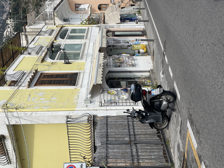The scene depicts a street view in Arienzo, Italy, featuring a two-story building complex adjacent to a paved road and sidewalk. In the foreground, a dark grey asphalt road occupies the lower portion of the image. A solid white line delineates the right edge of the road, alongside a dashed white line and a partial yellow curb line. A black scooter with a rear storage box is parked on its kickstand on the sidewalk to the left, facing away from the viewer. The scooter bears an Italian license plate, "EH 0285B". The sidewalk is light grey concrete, featuring several dark grey bollards along its edge. To the far left, a tall, vertical slatted wooden gate is visible, behind which a red circular "No Entry for Vehicles" sign is partially obscured. The midground is dominated by a multi-story building. The main section is painted yellow, exhibiting significant peeling and weathered paint across its facade. The ground floor houses a shop with a cream-colored retractable awning inscribed with "Arsutia". The shop's storefront features glass doors and windows, with black metal grid displays affixed to the exterior walls, showcasing numerous colorful ceramic plates, bowls, and pottery, some with lemon motifs. The upper floor of this building includes a window with brown louvered shutters on the left and two arched windows with white frames on the right. A black, ornate street lamp extends from the wall between the arched windows. Above the ground floor and below the upper windows, black wrought iron railings are present. To the right, a narrower, lighter-colored building is partially visible, featuring a white-railed balcony and an external air conditioning unit. A secondary shop with a cream awning and clothing displays is also visible further down the street on the right. The background reveals distant hills or mountains, sparsely vegetated and dotted with light-colored buildings, under a clear sky. No individuals or specific actions are discernible within the frame.