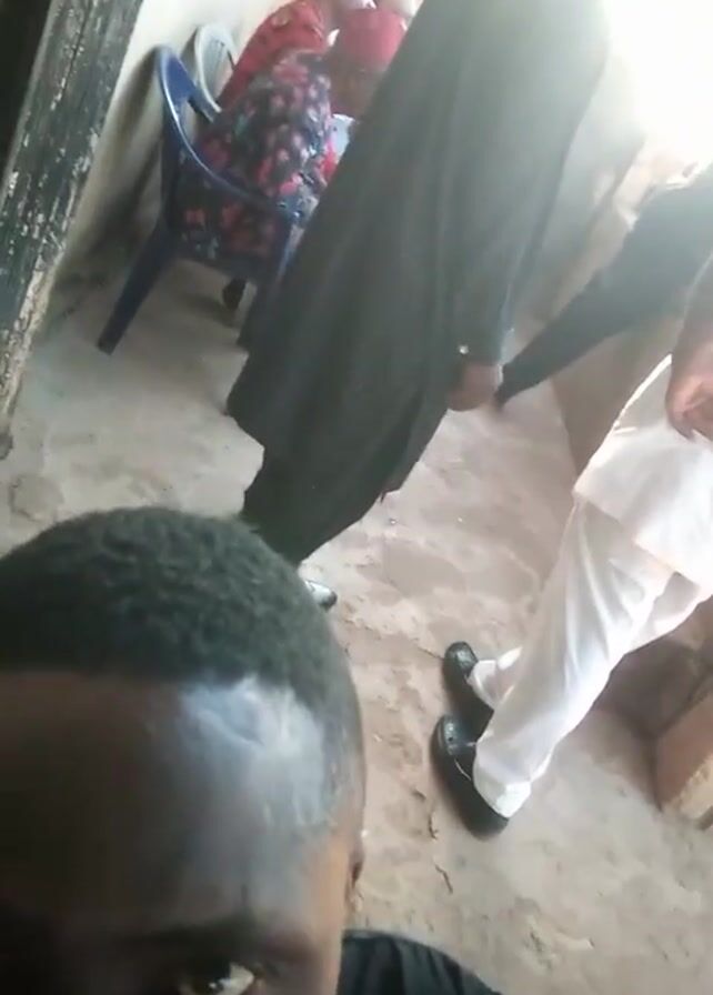 man holding a camera and filming a group of people. The man filming has short hair and is wearing a black shirt. In the background, there are three people. Two are seated and wearing red hats and colorful clothing. Another person is standing and wearing a long dark coat and black shoes. A fourth person is wearing white pants and black shoes. The scene appears to be inside a building or a courtyard. The floor is concrete and the walls are painted. There is a plastic chair near the seated figures. The lighting is bright.