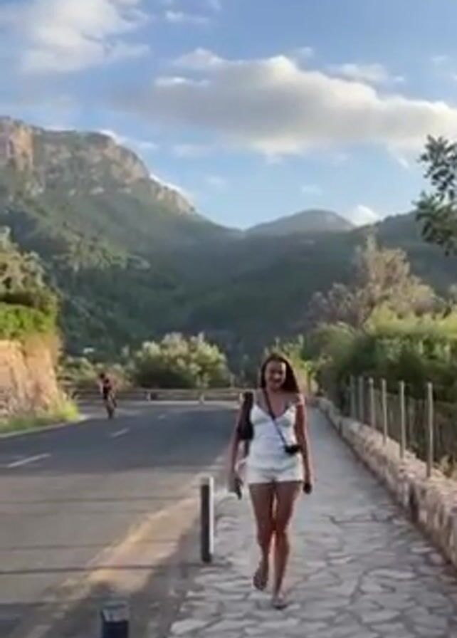 A woman walks along a stone sidewalk next to a road with mountains in the background under a partially cloudy sky. She wears a white top and shorts and carries a black bag. A cyclist rides past her on the road, wearing a red and blue shirt and black shorts. The cyclist speeds past the camera.