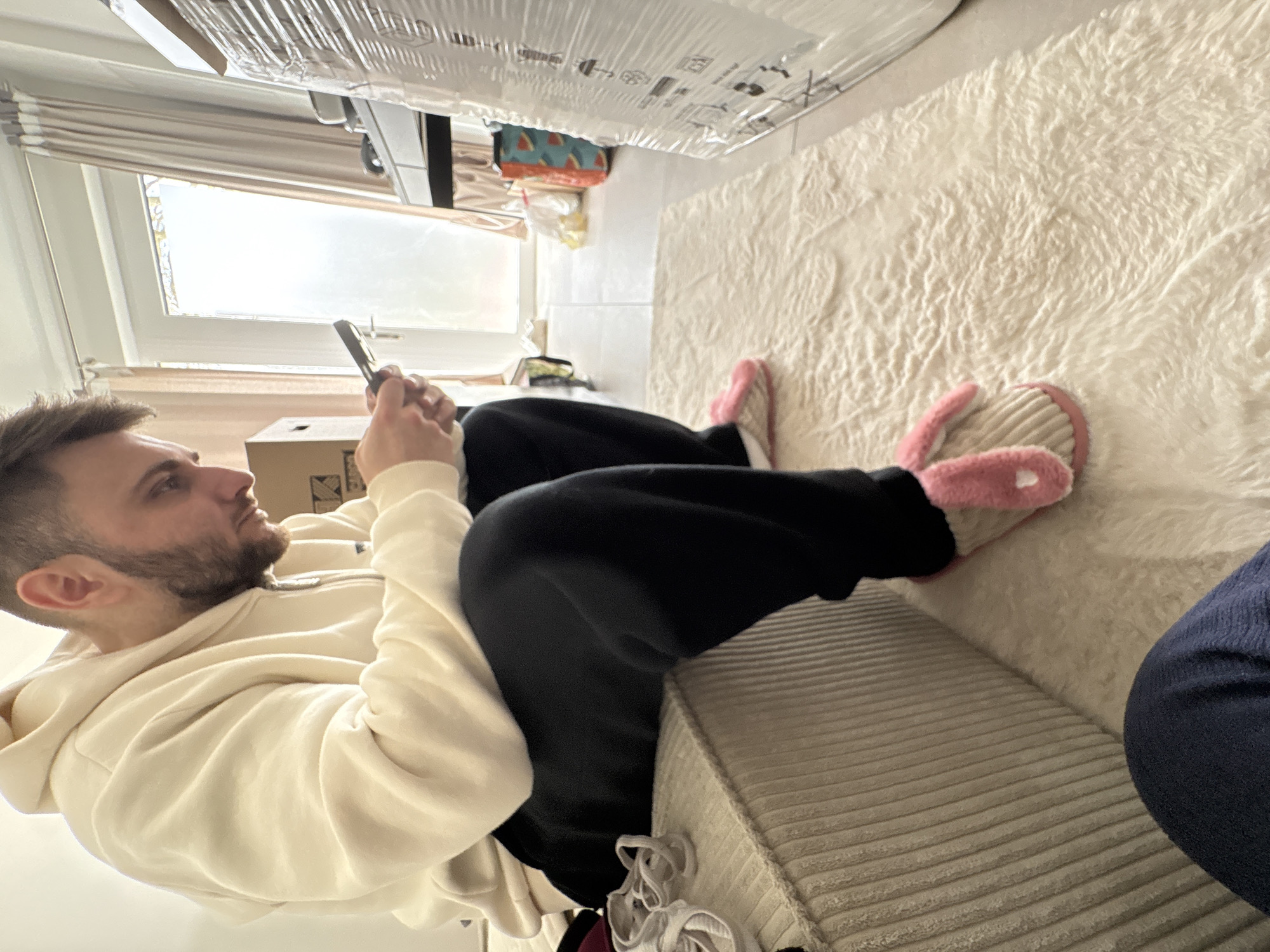 A man with short brown hair and a beard, wearing a beige hoodie and black sweatpants, is sitting on a gray couch in an indoor setting, possibly a living room. He is holding a mobile phone in his hand and appears to be looking at it. He has pink slippers on his feet, which are resting on a cream-colored rug. A window with a light-colored blind is visible in the background, and sunlight is streaming in. Partially visible in the background are boxes wrapped in protective material. Another person, wearing a navy blue sweater, is partially visible on the right side of the couch. The location cannot be determined to be Mönchengladbach, Germany from the image alone.