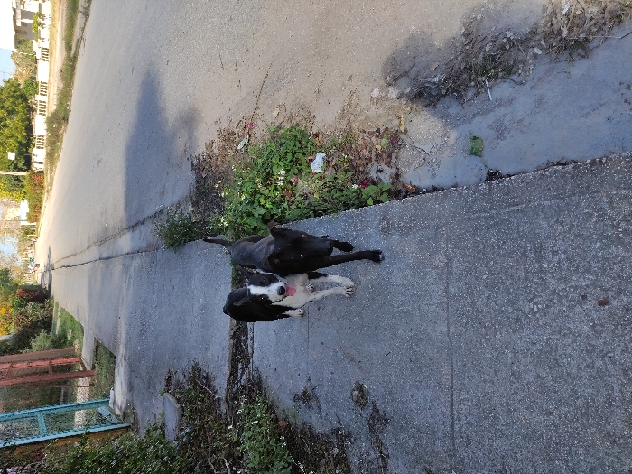 The image captures an outdoor street scene in Ciego de Ávila, Cuba. In the foreground, two medium-sized dogs are positioned on a grey concrete sidewalk. The dog on the left is bicolored, featuring a white face with a prominent black patch over its left eye and ear, a white chest, and dark fur elsewhere on its body. Its mouth is open with its pink tongue extended. Adjacent to it, to the right, a dark grey or black dog stands partially behind and to the right of the first dog, with its head also oriented towards the viewer. The concrete sidewalk exhibits surface cracks and patches of dirt. To the right of the sidewalk, a paved asphalt road extends into the background, showing a smooth, dark grey surface with shadows cast upon it. Sparse green vegetation, consisting of weeds and small plants, grows along the interface between the sidewalk and the road. On the left side of the image, beyond the sidewalk, dense green foliage is visible, partially obscuring a light blue metal gate or fence section next to a reddish-brown vertical post. In the distant background, the road continues, flanked by various trees and indistinct building structures under bright daylight conditions.