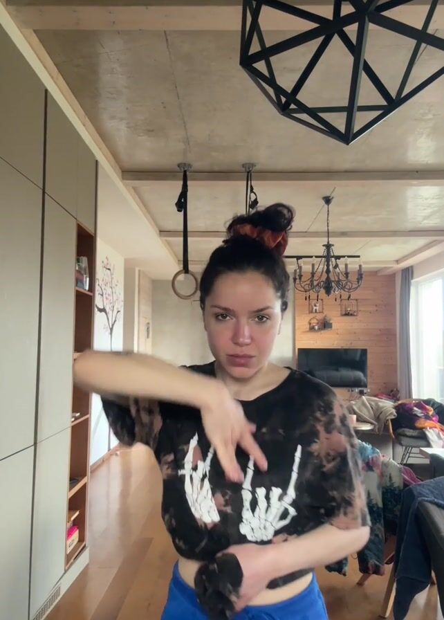 A woman is dancing in her living room. She is wearing a black and brown tie-dye t-shirt with a white skeleton hand design, and blue pants. Her hair is styled in a high bun. The living room is decorated with modern furniture, including a large geometric light fixture, a chandelier, and a wood-paneled wall with a television. There is a couch and miscellaneous items like a jacket. The woman moves her arms and body in a rhythmic fashion, following the music.