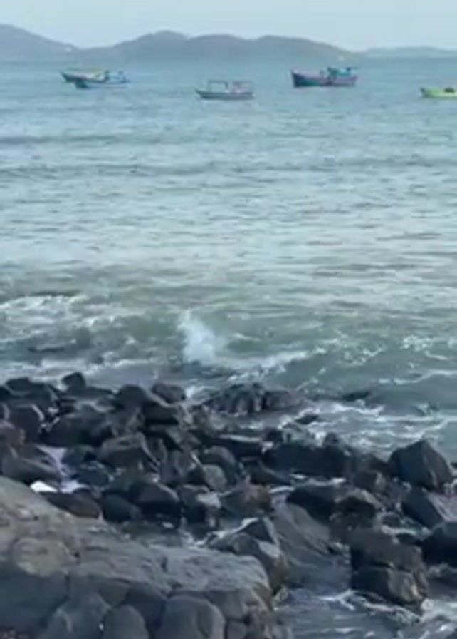 rocky shoreline with waves crashing against the rocks. In the distance, several small fishing boats are visible on the water. The sky is overcast, creating a muted, grey light over the scene. The camera is static and provides a wide shot of the coastline. The overall impression is one of a serene, coastal landscape.